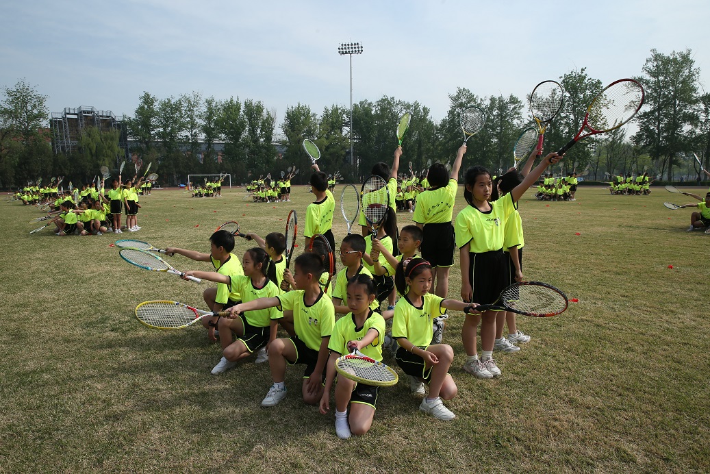 在运动员代表和裁判员代表进行宣誓后,农学院附小的300名学生进行了精彩的网球操表演。“高参小”项目是北京各高校、社会组织参与小学体育、美育发展工作的简称。旨在通过高校、社会组织的优势资源,帮助小学从体育、美育方面,提升素质教育,让这部分小学成为优质学校,改善基础教育的不均衡状况。“高参小”项目自2014年9月正式实施,至今已近两个学年。网球是金年会jinnianhuicom对农学院附小重点扶持的体育项目,网球操是农学院附小特色体育项目之一,创造性的技术动作、表演的生动性趣味性受到社会各界人士的认可。
