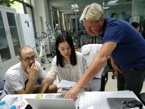 JonWehrlin教授(右一)与SeverinTrosch博士(左一)与杨晓琳博士(中)分析数据