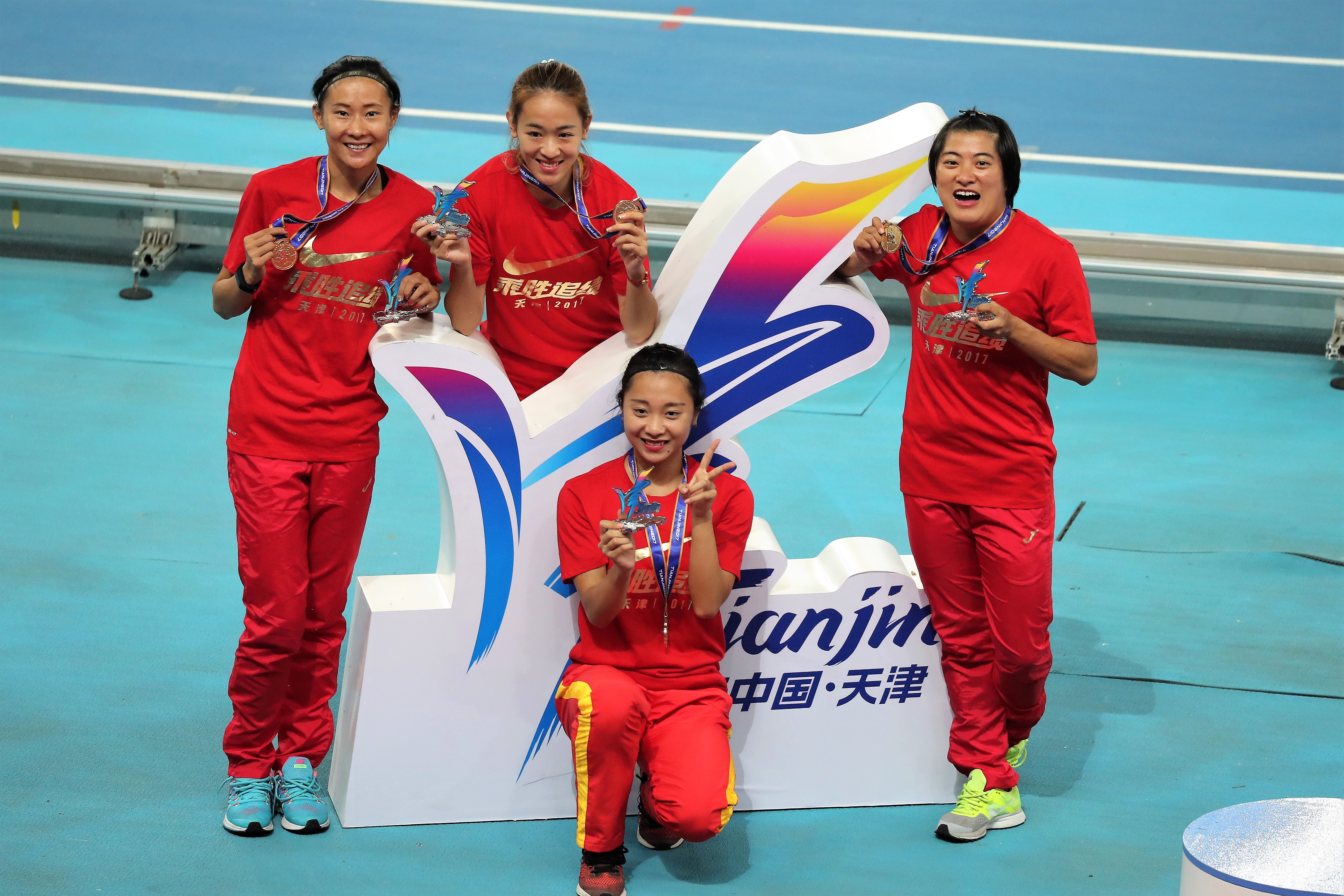 吴智强(右一)与队友夺得4x100米金牌 在女子4x100米的比赛中,由葛曼棋、林慧君、蒋兰、袁琦琦组成的苏闽湘队力压由梁小静、孔令微、陶宇佳、韦永丽组成的国内最强阵容,以42.59秒的成绩夺冠。