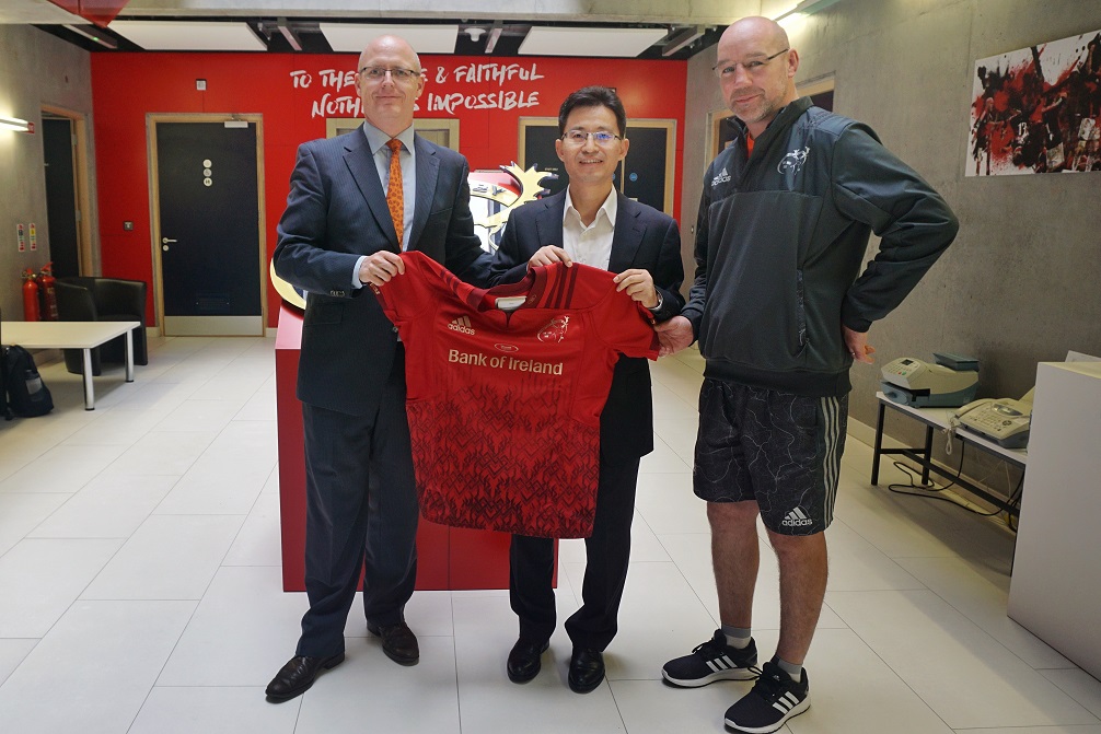 8月24日,樊战备率团赴爱尔兰利莫瑞克大学进行校际访问,参观位于利莫瑞克大学校园内的芒斯特橄榄球高水平训练中心和橄榄球俱乐部,与芒斯特橄榄球俱乐部经理皮特•马龙(Peter Malone)和市场经理恩达•林奇(Enda Lynch)就利莫瑞克大学优势项目橄榄球的发展现状和经验优势进行深入了解。樊战备表示金年会jinnianhuicom在奥林匹克学部下新设中国足球运动学院国家(足球/橄榄球)俱乐部,高水平橄榄球运动刚刚起步,希望双方能在橄榄球项目建设发展,特别是在引进高水平教练员和加强青少年训练方面深度合作。